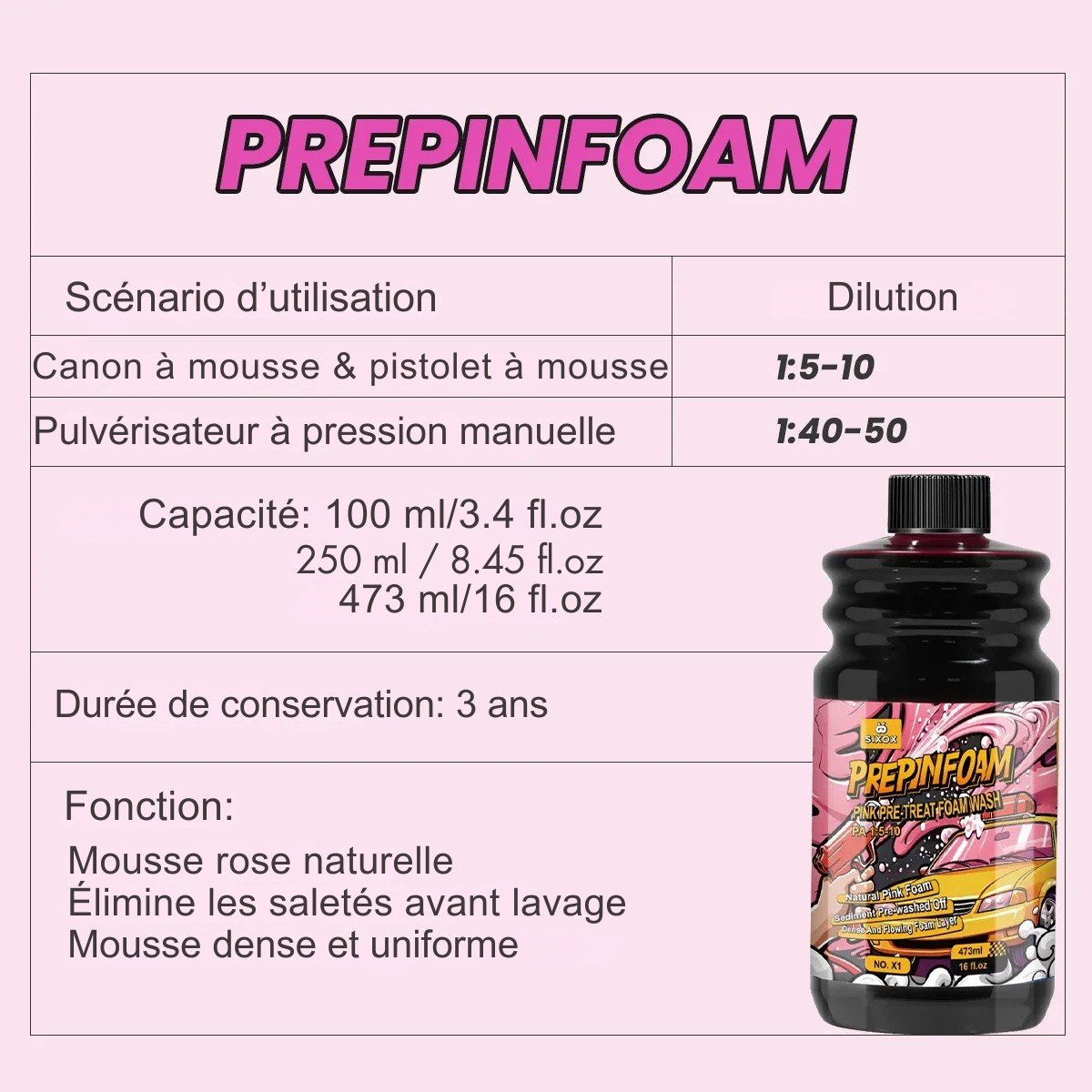 En tant que mousse de prétraitement pour le lavage automobile, ce produit est capable de dissoudre et d’éliminer la saleté et les débris de la surface du véhicule, réduisant ainsi le risque de rayures sur la peinture pendant le lavage.